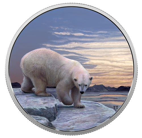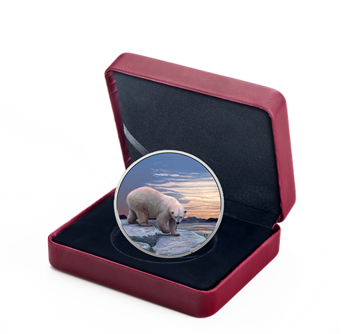 Canadian artist Trevor Tennant created an immersive design that takes you within feet of a polarbear navigating the sea ice. Exceptional detail andbeautifully executed colour capture the subtleties in the bear's thick coat, and the warm glow of the setting sun that fills the Arctic sky and mirror-like openings in the sea ice. When you expose your coin to black light, a different scene appears: Day turns to night as the sun sets behind a fiery orangehorizon, and northern lights fill the sky with a ribbon of glowing yellow and green.