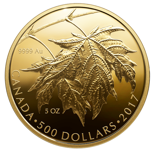 Designed by Canadian artist Margaret Best, your coin presents a timeless portrait of a true Canadianicon. The mirror-like gleam of the coin's surface mimics the sun's golden rays and evokes allthe warmth of a summer day. In the centre, two sugar maple (Acer saccharum) leavesgently overlap, their stems naturally pointing outward from the single branch. The larger leaf in the foreground allows for a more detailed rendering of its features, which have been precisely engraved to give the artistic design an enhanced sense of depth and realism. The reverse includes the engraved face value "500 DOLLARS", the purity level "9999 AU" and weight "5 OZ", the word "CANADA", and the year "2017". The obverse features the effigy of Her Majesty Queen Elizabeth II by Susanna Blunt.