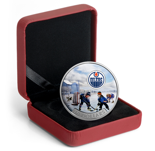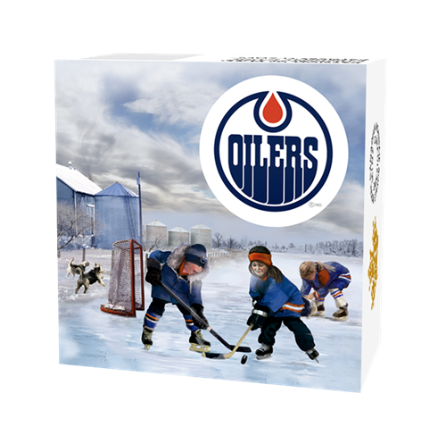 Designed by Canadian artist Silvia Pecota, your coin features full colour over an engraved scene that transports the viewer to a rural community near Edmonton. A brisk winter day offers the perfect opportunity for youths to play some hockey out on the frozen ice surface, not far from the silos, farms and trees that dot the landscape in the background. Wearing winter coats, hats and even jerseys that are in step with the colours of their beloved home team, these youths show their enthusiasm through broad smiles andglowing expressions! In the foreground, two players cross their sticks as they fight for control of the puck near an unguarded net; behind them, one child is preparing its equipment before joining in thisexciting game of shinny hockey. Above them is the familiar blue, white and copper-coloured logo of theEdmonton Oilers.