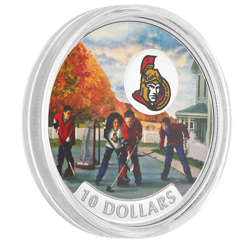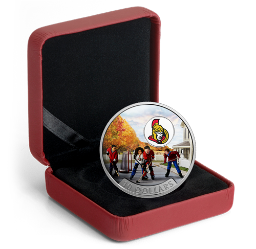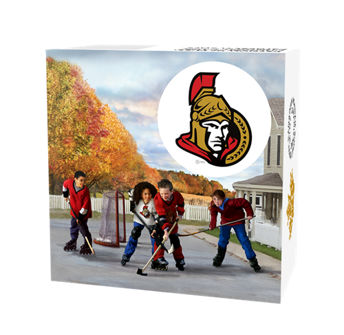 Designed by Canadian artist Silvia Pecota, your coin features full colour over an engraved scene that celebrates hockey in the nation's capital, where young Ottawa Senators fans head outdoors to play street hockey. The autumn colours of Eastern Ontario are in full view in the background, where the red, orange andyellow maple foliage adds a burst of colour to a balmy afternoon in this quiet residential neighbourhood. Four youths on roller blades scramble for the puck. One boy rolls behind the unguarded net to jointhe boy and girl in the foreground, each one bearing a wide grin that is a natural expression of theirenthusiasm and deep love for the game. Above them,the team logo of the Ottawa Senators features a forward-facing Roman senator wrapped in a red-colouredcape and set against a semi-circle of laurel leaves, whose “O” shape is associatedwith the home city of Ottawa.