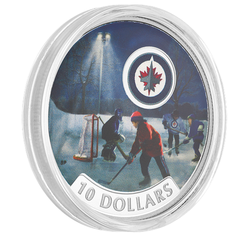 Designed by Canadian artist Silvia Pecota, your coin featuresfull colour over an engraved scene, which is set at an outdoor rink in Manitoba. Beneath the overheadlights, four youths share a love for the game as they continue to play into the evening. In the foreground, one player in red, skates towards the boards to retrieve the puck, while the two other players onthe right are still in position from the last attempt to score. The goaltender stands before the net,somewhat relaxed but with eyes trained on the two players closest to the crease. All four players are proudly wearing the blue, white and red colours of their beloved home team; above them is the official logo of the Winnipeg Jets, featuring a fighter jet over a maple leaf and all enclosed in a blue roundel.