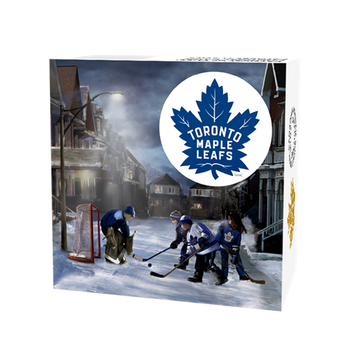 Designed by Canadian artist Silvia Pecota, your coin features full colour over an engraved scene that pays tribute to the hockey legacy of the Toronto Maple Leafs®. On this quiet residential street, a fast-paced game of street hockeyhas outlasted daylight; under the glare of the street light overhead, four young Leafs fans are dressed in their warmest winter gear, which match their favourite team's colours. Winter's chill hasn't slowed them down—each breath isvisible in the cold air as two players rush to the net. With each player racing to steal away the puck, one closes in on it to try to poke it past the fourth youth guarding the net. There's a timelessquality to this scene that could have easily takenplace years ago, were it not for the brief glimpse of recent models of cars parked in the background. Above these passionate young players is the TorontoMaple Leafs iconic logo in the team's blue andwhite colours. The reverse also features the engraved face value “10 DOLLARS”. Theobverse features the effigy of Her Majesty Queen Elizabeth II by Susanna Blunt.