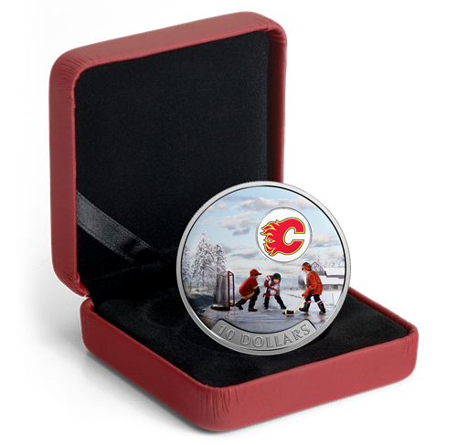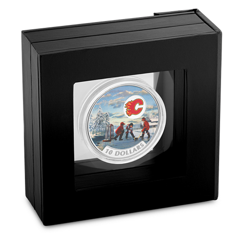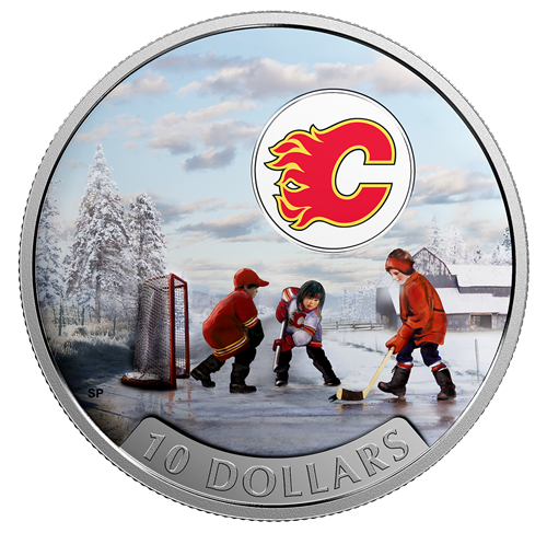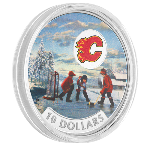 Designed by Canadian artist Silvia Pecota,your coin features full colour over an engraved outdoor scene. In a rural community outside of Calgary, three youths are immersed in their game of road hockey. The passion these young players have for the game is evident by their body language, as each leans into the play. To the right, a player has possession of the puck and tries to line up a shot, while another reaches across to steal the puck away. The third player crouches slightly in front of the net,trying to anticipate the shot so that he might prevent it from entering the net. All three are proudlywearing the colours of their favourite team, whichstand out against the white of the snow- and ice-covered landscape. Above the scene is the Calgary Flames® logo, with its flaming red “C” outlined in black and yellow.