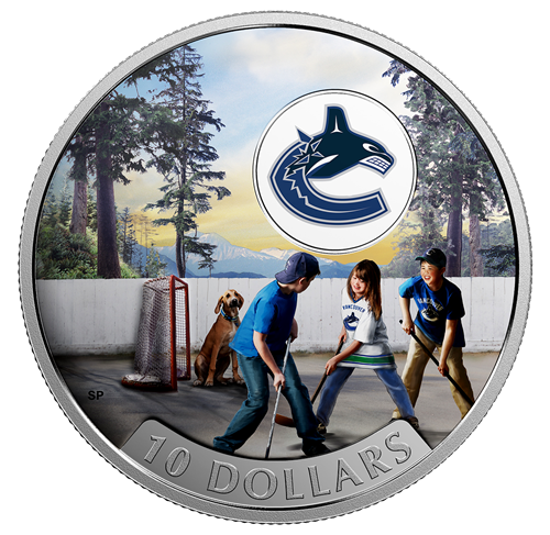 Designed by Canadian artist Silvia Pecota, your coin features full colour over an engraved hockey-themed scene. The ice-capped mountain peaks and tall conifers provide a stunning backdrop to this scene set in Western Canada, where a group of youths have gathered to play hockey on a paved outdoor rink. A lack of ice does little to deter these players on this balmy afternoon: with a canine friend in net, one player uses his body to help maintain “puck” possession while two others look for an opportunity to steal the ball away. The smiles on the boy and girl's faces show the light-hearted nature of this game, while all three players proudly wear their home team's colours. The two youths on the right are depicted wearing t-shirts with the Vancouver Canucks logo; a larger version of the logo appears above them, with its familiar Haida art-inspired rendition of a breaching orca jumping out of the “C”-shaped ice.