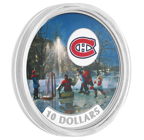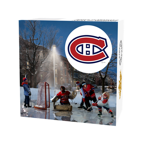 Designed by Canadian artist Silvia Pecota, your coinfeatures full colour over an engraved hockey-themed scene set at an outdoor rink. The sun has set over this neighbourhood, but that hasn't stopped agroup of youths from continuing their game well into the evening. Under the glow of a street light, five youths proudly wear their team colours and skates as they play over the mirror-like ice surface. While one player looks on, two players find themselves tied up in their efforts to get the puck; meanwhile, another player has possession of the puck and takes the shot—it's a goal! Kneeling onleg pads, the goaltender turns to look behind in disbelief at the puck in the net. Above the scene isthe Montreal Canadiens® logo, with its iconic red “C” outlined in blue and white, and a smaller “H” inside.