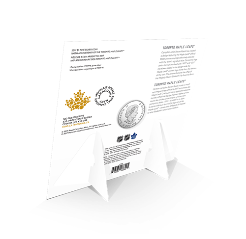 The centennial season of the Toronto Maple Leafs® will shine forever withthis must-have 99.99% pure silver and its dash of official Leafs' blue to highlight this historicyear. A banner with the years "1917" and "2017" has also been added while a series of concentric rings inspire thoughts of face-off circles and hockey pucks. Add the team's current logo, and the excitement of the Leafs' first century is complete!