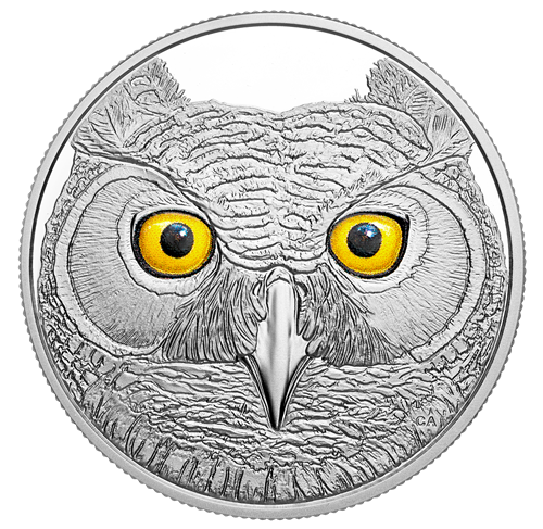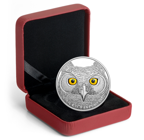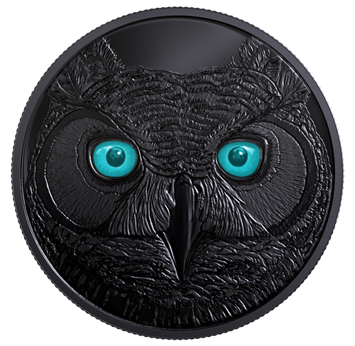 The indomitable spirit of the great horned owl (Bubo virginianus) is evident in your coin's design by Canadian artist Curtis Atwater. The close-up portrait of its broad face features complex engraving that adds textural details throughout, especially in the rendering of its plumage. Special emphasis is placed on the owl's eyes, wherean enamel effect mimics the glossy look of a traditional paint application, but with far more colour variances that give the amber-coloured irises a morelife-like appearance. They are further enhanced byglow-in-the-dark technology that adds a luminous intensity to the piercing gaze, which offers the onlyvisible proof of the owl's presence in the dark. The obverse features the effigy of Her Majesty Queen Elizabeth II by Susanna Blunt.