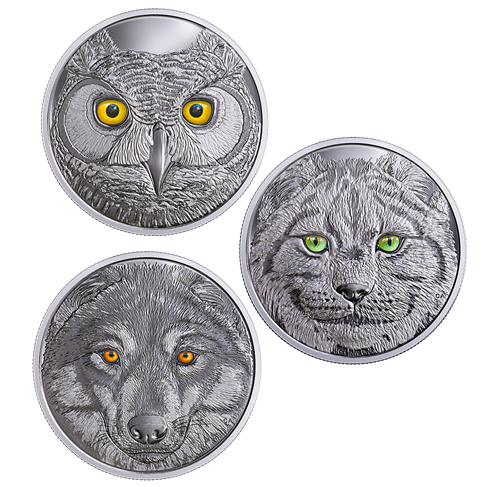 Beginning with the great horned owl, this three-coin series takes a closer look at these extraordinary facial features. Each pair of animal eyes is beautifully enhanced with a glossy enamel effect that adds unprecedented colour complexity, while glow-in-the-dark technology allows them to peer out from the dark!