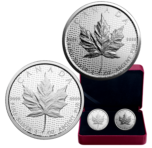 - DOUBLING UP ON SILVER! The signature symbol of Canada, the iconic maple leaf is exquisitely engraved in two 1-ounce coins of .9999 pure silver.