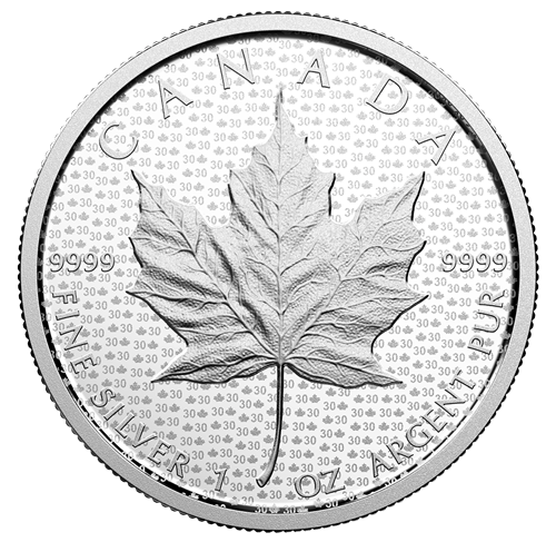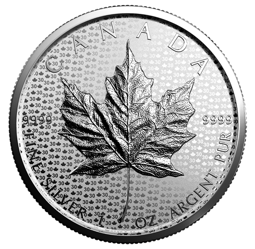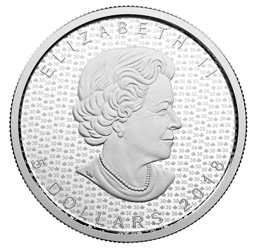 - LASER-ENGRAVED PATTERN! Filling the field on the reverse and obverse, the repeating pattern of a maple leaf with the number "30" is a visually unique way of commemorating this special anniversary. The laser-engraved pattern diffracts light, creating a wondrous hologram-like effect that adds a luminous quality to the design.