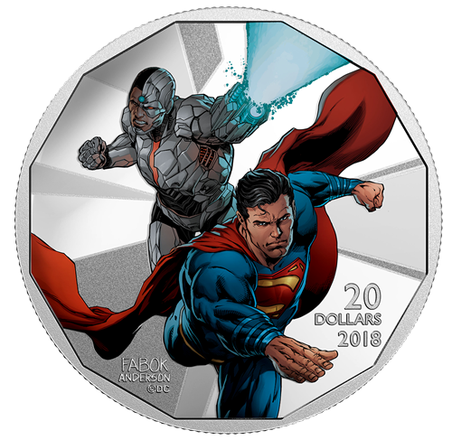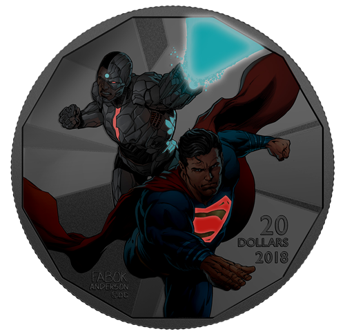 Exclusively designed by Canadian comic book artist Jason Fabok, the original art on the reverse features two members of the Justice League in an action pose. With his left fist clenched, Superman lunges forward in theforeground, his cape billowing behind him as he moves towards the viewer. Cyborg joins in the rush, his right fist pulled back as he emits a blast with his cannon arm. The artwork is brought to life by the rich, vibrant colours of Canadian colorist Brad Anderson, with special colour applications that add glow-in-the-dark elements—specificallySuperman’s S-Shield and eyes as he uses his heat vision, and Cyborg’s cybernetic parts. In the background, the frosted look of laser-engraved polygon shapes creates a “shattered glass” effect that adds to the feeling of movement within the design, while providing an element of continuity to all three 1 oz. coins in this collection. The reverse also features theengraved face value “20 DOLLARS” and the year “2018”. The obverse features the effigy of Her Majesty Queen Elizabeth II by Susanna Blunt.