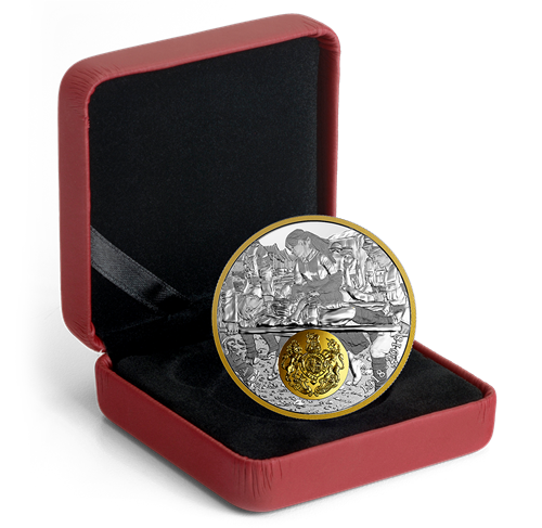 Designed by Canadian artist Pandora Young, your coin depicts a field hospital located near the front during theFirst World War. While the pointed peaks of medicaltents can be seen in the background, the presence of several stretcher‐bearers and other personnel suggest a battle is underway and casualties are arrivingfrom the front lines. Special finishes place the focus on the British nurse in the foreground, whose quick movements reflect a sense of urgency; keeping pace with the stretcher‐bearers, her gaze is fixed on the wounded soldier as she quickly assesses his condition while providing words of comfort. The engravedimage is paired with the gold‐plated General Service button. The selectively gold‐plated obverse features the effigy of King George V by Sir E. B. Mackennal.