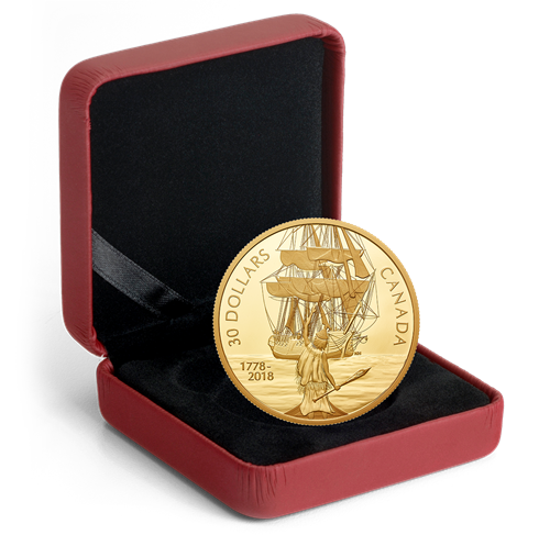 After exploring the South Pacific and crossing the Antarctic Circle in his first two voyages, Captain James Cook (1728-1779) turned his attention to the north for his third epic voyage, setting sail for thefabled Northwest Passage—a quest that brought his expedition to our western shores in 1778. Your gold-plated coin commemorates Cook’s historic arrival on the west coast of present-day Vancouver Island, near Yuquot, the summer home of the Mowachhat people. Rich in detail, your intricately engravedcoin depicts HMS Resolution from the viewpoint of the native people who greeted and traded with the two-ship expedition that left an indelible impact on Canada’s early history.