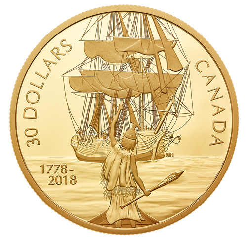 Designed by Neil Hamelin, your coin depicts Captain Cook’s expedition sailing into Nootka Sound at the end of March 1778. Viewed from the ocean-going canoe in the foreground, HMS Resolution is a towering sight on the water, as the Mowachaht beach keeper and his companions arepaddling out to greet the ship and its crew. Dressed in traditional clothing, the beach keeper standswith one arm raised while his right hand grips a paddle bearing a traditional motif. The reverse includes the engraved face value “30 DOLLARS” and the word “CANADA” and features a double date “1778-2018”. The obverse features the effigy of Her Majesty Queen Elizabeth II by Susanna Blunt.