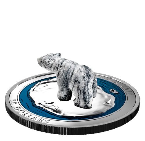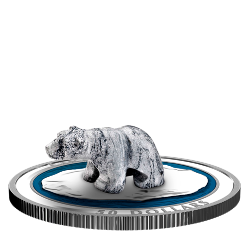 The natural beauty of Northern Canada shines bright on your coin, thanks to a harmonious mix of finishing techniques and a polar bear soapstone sculpture that makes each coin unique. As it does forArctic marine life, ice floe provides the foundation for this design: engraving provides a life-like textural effect, while a special frosting gives thesnow-covered ice a more matte-like appearance. The surrounding water is a sparkling shade of blue, thanks to the application of translucent enamel over the proof finish. But the focal point is undeniably the sculptured piece that rises up from the ice floe: each polar bear sculpture has been hand-carved from Canadian soapstone by Canadian artist Dave Zachary and his team of sculptors. With its gaze fixed onwhat lies ahead, the polar bear cuts a formidable figure in this Arctic landscape, where it is regarded as an icon of strength and endurance.