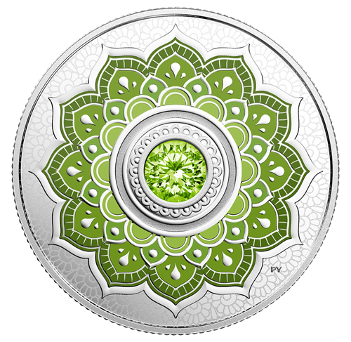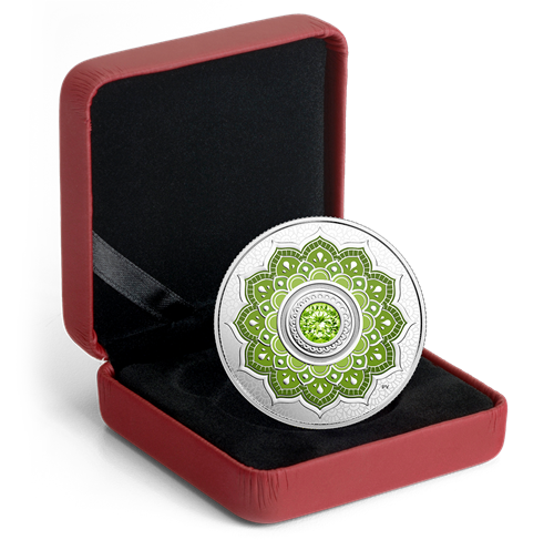 Designed by Pandora Young, your coin presentsa cross-cultural celebration inspired by the ancient tradition of Indian mehndi. A symmetrical arrangement of highly ornate shapes and symbols form a 12-point radial pattern that reflects the calendar year. A prominent henna motif—the lotus—is among the finely detailed elements that emanate from the centre, where a colourful Swarovski® crystal represents the August birthstone, peridot. A selective application of colour complements the stone, while the playful contrast between soft and vivid tones highlights the layered complexity of the engraved artistry. The obverse features the effigy of Her Majesty Queen Elizabeth II by Susanna Blunt.