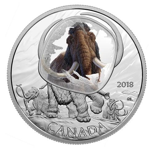 Designed by Canadian artist Glen Loates, your first coin in your 2-coin subscription portrays a snowy Ice Age landscape with a herd of mammoth traversing a frozenplain. The image centres on a single mammoth who faces the viewer, its massive tusks rising high into the sky. The image is overlain with a frosted “ice” like dome. The portion of the portrait under the ice is coloured, while the remainderof the image is struck-only. The reverse includes the text “CANADA” and the date “2018.” The obverse features the effigy of Her Majesty Queen Elizabeth II by Susanna Blunt, as well as the coin value of “20 DOLLARS.”