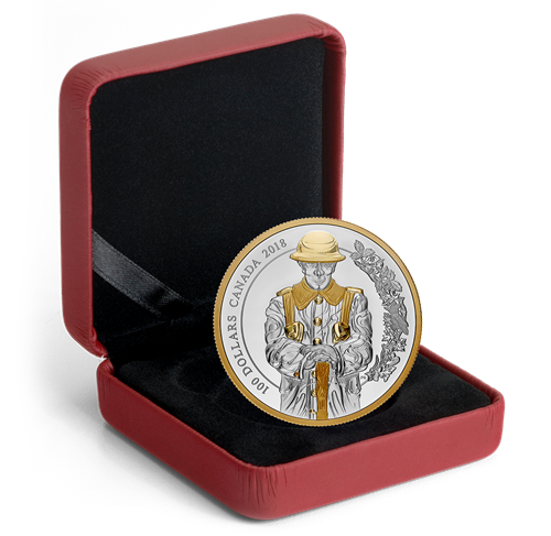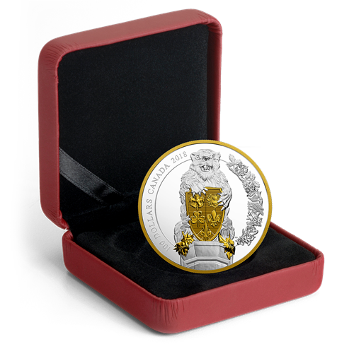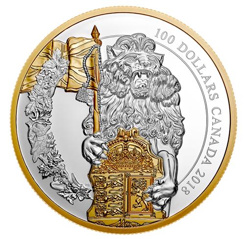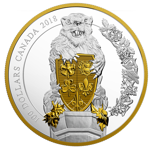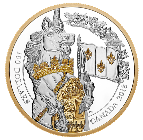 Designed by Canadian artist Patrick Bélanger, the first coin in your subscription, the unicorn, stands before the ceremonial entrance on Parliament Hill, in Ottawa, Ont., where the unicorn supporter of the Arms of Canada is carved into the sandstone that lines theeast side of the arched entry. On the reverse, thismythical creature rises up in a way that conveys the towering height (1.8 m) of its real-life counterpart. It supports the shield of the Arms of Canada andcarries the Royal flag of France. Gold plating selectively highlights the chained coronet of crosses and fleurs-de-lis around the unicorn’s neck,and the three fleurs-de-lis on the banner. The positioning of the sculpted figure is slightly adjusted to allow the inclusion of an ornamental flourish, whose floral motif is based on a frieze that also adorns the Centre Block’s grand entrance. The reverse includes the face value, “100 DOLLARS”, and the words “CANADA 2018”. The obverse features the effigy of Her Majesty Queen Elizabeth II by Susanna Blunt.