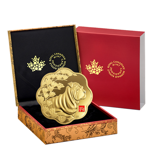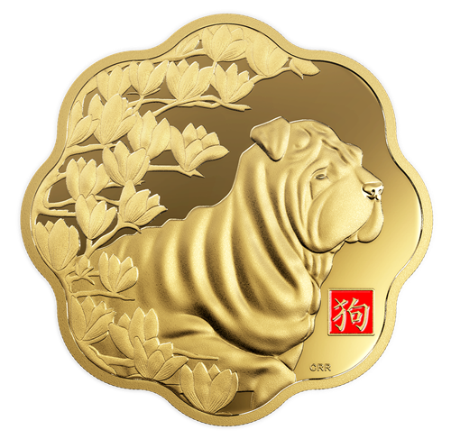 To commemorate 2018 as the Year of the Dog, the reverse emphasizes the noble traits of the Chinese zodiac animalthat represents those born in 1910, 1922, 1934, 1946, 1958, 1970, 1982, 1994, 2006 and 2018. Viewed in side profile, the dog is the very image of a faithful protector and courageous companion as it looks beyond the coin's scalloped rim. Beneath its muzzle, the engraved Chinese character for "dog" is engraved within a red-enamelled box that adds a colourful element of good luck. Branches of magnolia blossoms provide a breathtaking ornamental flourish on the left side of the coin; they too are symbolic, for the blooms represent purity and nobility—it's a fitting floral tribute to a sign associated with some of humanity's morevirtuous qualities. The obverse features the effigyof Her Majesty Queen Elizabeth II by Susanna Blunt.