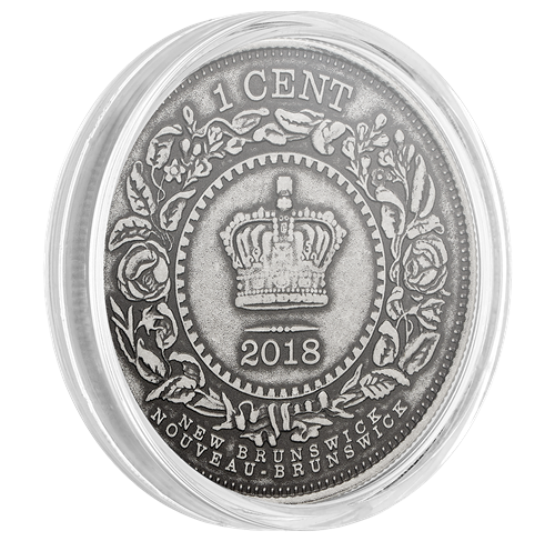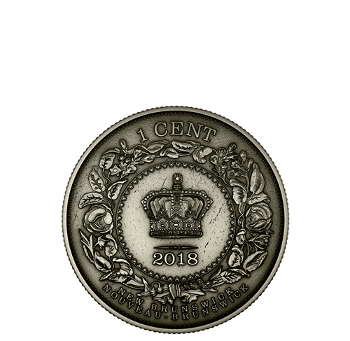 The Newfoundland five cent is set apart by its more ornamental design. Based on an 1880 issue, the reverse features the denomination “5 CENTS” and the date “2018” framed by an arabesque pattern. - New Brunswick one cent: