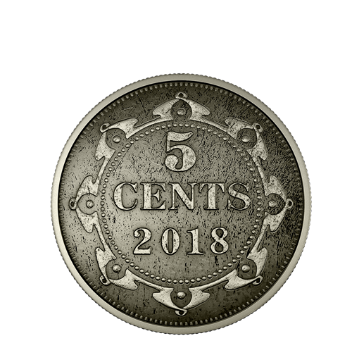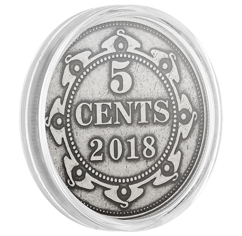 The Prince Edward Island one cent was the only decimal coin ever struck for the province. Released in 1872, the reverse features an oak tree motif adapted from the provincialgreat seals. The face value “1 CENT” and Latin motto PARVA SUB INGENTI (The small under the protection of the great) are inscribed beneath a tall oak tree representing Great Britain, while three oak saplings symbolize the counties of Prince Edward Island. - Newfoundland five cent: