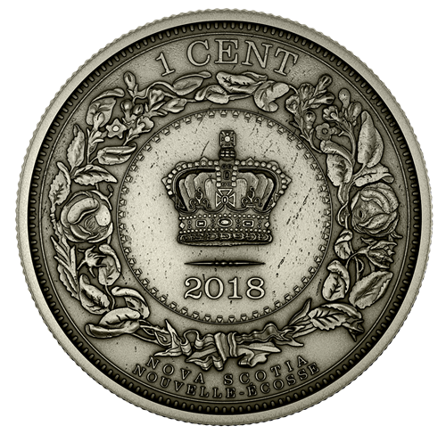 Modelled after the 1861 issue, the Nova Scotia one cent features a wreath of roses and mayflowers encircling St Edward’s Crown at the centre, where an ornamental flourish and the date “2018” are engraved. - Prince Edward Island one cent: