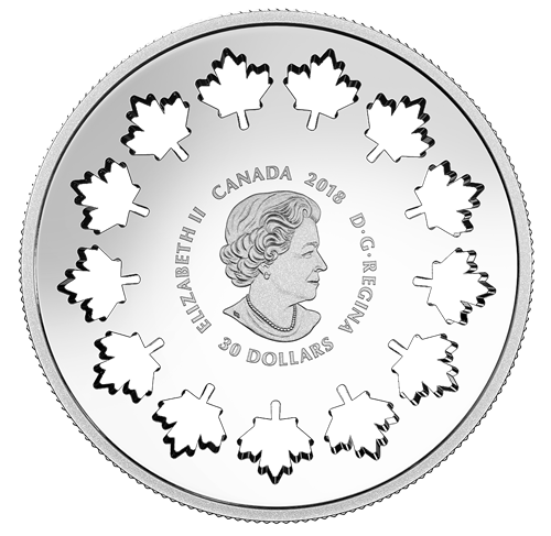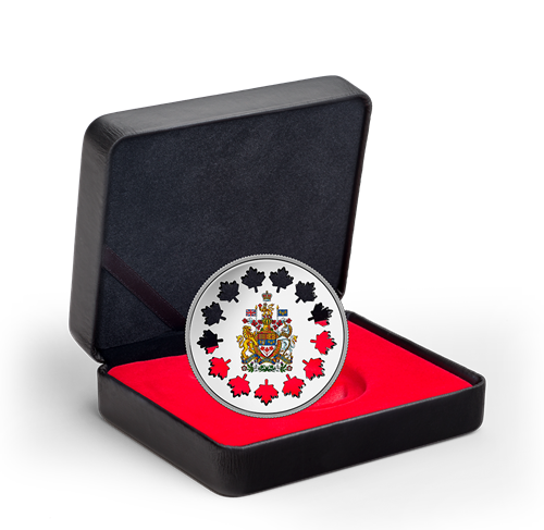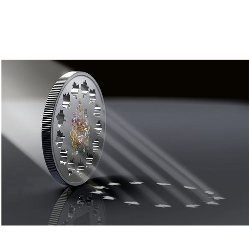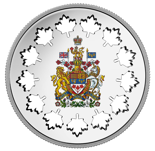 Thirteen cut-out maple leaves form a circle around the current Arms of Canada that has been engraved to the finest detail, and selectively coloured to showcase the beauty of this ancient art form to full effect. On the obverse, the effigy of Her Majesty Queen ElizabethII appears at the centre, encircled by an inscription with the denomination, and framed by the circle of cut-out maple leaves.