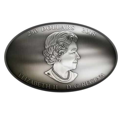 Your oval-shaped, concave, toned-and-lacquered coin is 99.99% pure silver. It has a long diameter of 161.8 millimetres and a short diameter of 100 millimetres, with a nominal metal weight of 1,010 grams. RCM engraver Matt Bowen has created this immersive design of Voyageurs paddling a canoe in the upper Ottawa River. They have just cleared a treacherous cascade, the force of the current almost launching the canoe from the coin's ultra-high relief. Water churns beneath theirpaddles as the Voyageurs move in unison, their quick and coordinated strokes ensuring they pass throughthe rapids intact. Deeply carved boulders give riseto formidable riverbanks where the white water begins. In the distance, the river disappears around a bend, its shores choked with coniferous trees that greatly enhance the sense of perspective and the vastness of the landscape.