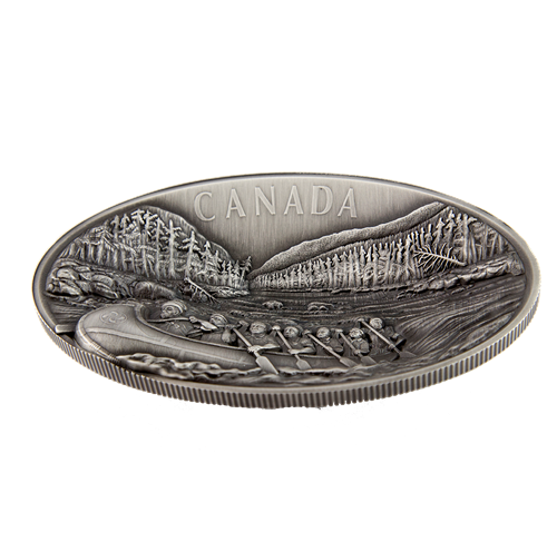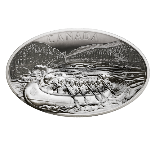 Get set for adventure with our first-ever kilogram coin featuring a unique oval and concave shape, with special finishes and ultra-high relief, that takes you to the Ottawa River where a team of Voyageurs has just cleared a treacherous cascade, their canoe almost launching itself from this incredibly sculpted and immersive design. Travelling to the Great Lakes was a gruelling voyage. Voyageurs paddled as much as 50 strokes a minute, and carried hundreds of kilograms across difficult portages. Their endurance, strength and courage were unimaginable, but the lure of money and adventure was stronger still. By the start of the 18th century, 25% of Montreal's men were Voyageurs, regardless of class or social status. This population dropped as the population grew through the 18th century. To this day, Canada's untamedwaters continue to lure thrill-seekers into the wilderness.