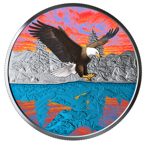 Set over Canada’s Pacific coastal waters, the reverse image by Julius Csotonyi evokes a sense of awe and reverence for both the bald eagle (Haliaeetus leucocephalus) and its coastal habitat. The multi-layered design depicts a sunny, summer day along the rocky shoreline, where the engraved evergreen trees reach for the blue-coloured sky overhead. Talons at the ready, a bald eagle swoops low over the shallow water, where translucentblue enamel stands in for the sky’s reflection without obscuring the underwater view. When viewed under a blacklight, the same scene transitions to dusk, as a fiery sunset lights up the sky and casts longer shadows on the water. The reverse includesthe word “CANADA”, the year “2019” and the face value, “20 DOLLARS”. The obverse features the effigy of Her Majesty Queen Elizabeth II by Susanna Blunt.