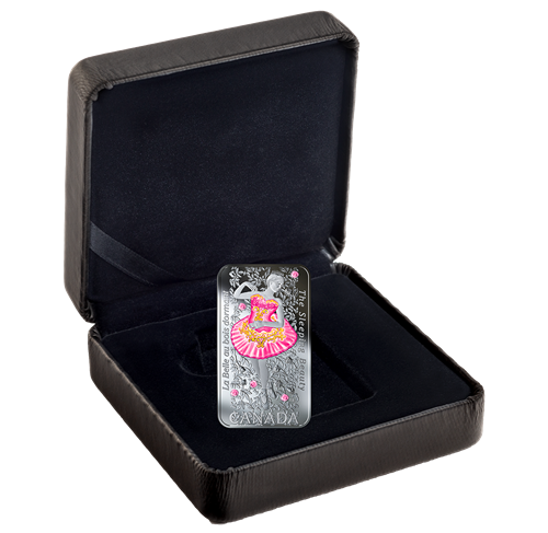 Designed by artist Tony Bianco, your coin is an artistic interpretation of the storybook ballet, The Sleeping Beauty. The vertical image of a ballerina performing the role of Princess Aurora is backed by a fairy-tale pattern of roses and leaves, which are struck incuse. Selective colour highlights the roses and the ballerina’s ornatecostume. The reverse includes the engraved words “CANADA” and the bilingual title of the ballet, “LA BELLE AU BOIS DORMANT THE SLEEPING BEAUTY”. The obverse features the effigy of Her Majesty Queen Elizabeth II by Susanna Blunt.