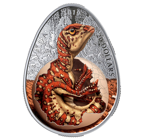 There are few places in the world where dinosaur embryos have been discovered, but Canada is one of them.In 1987, eggshells found at Devil’s Coulee, in southern Alberta, led to the discovery of one of the largest dinosaur nesting sites in North America. There, palaeontologists from the Royal Tyrrell Museum unearthed the fossilized remains of Hypacrosaurus stebingeri nests, eggs, even embryos—a rare find for a species that roamed the land 75 million years ago. A young duckbill dinosauremerges into a new world—ours—on our latest prehistoric-themed offering. The fine silver coin is the perfect shape for a colourful depiction of a baby Hypacrosaurus breaking free from its egg against an engraved forest backdrop.