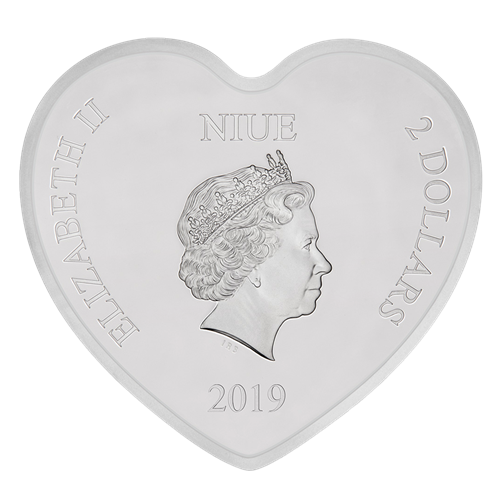 Your 1 oz. pure silver coin features a lovely illustrationof Disney’s colourful sweethearts, Mickey Mouse and Minnie Mouse, kissing above the word “Love”. The engraved background isadorned with love motifs, illustrating their enduring love for each other. Your coin was issued by theNew Zealand Mint as legal tender under the Pacificisland of Niue. The obverse of the coin features the Ian Rank-Broadley effigy of Her Majesty Queen Elizabeth II, the monetary denomination, and the 2019 year-date.