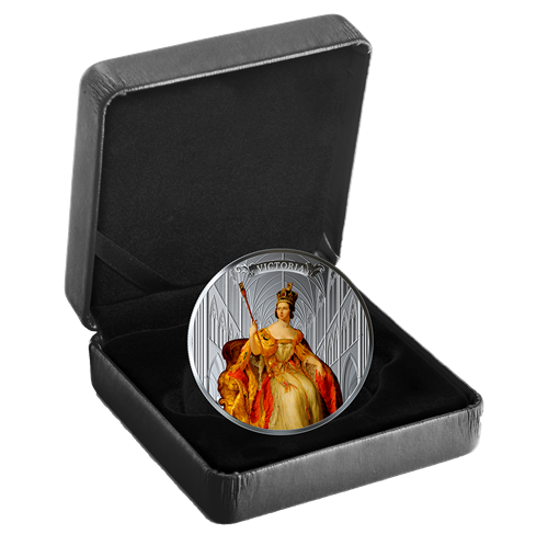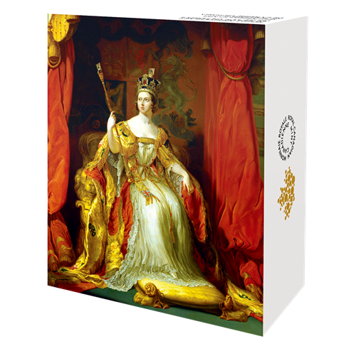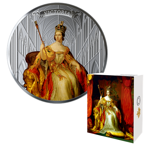 Your coin combines two officially licensed images from the National Portrait Gallery in London. A colour reproduction of the 1838 state portrait of Her Majesty QueenVictoria by Sir George Hayter depicts Her Majesty at the time of her Coronation on June 28, 1838. Seated on the gilded Homage Chair, Her Majesty wears the red and gold Coronation Robes and the Imperial StateCrown, and carries the Sovereign's Sceptre with Cross. The background is an engraved depiction of the site of the coronation ceremony, Westminster Abbey, and is based on an original etching by Wenceslaus Hollar. The reverse includes "2019" to commemorate the bicentennial of the birth (May 24, 1819) of Her Majesty Queen Victoria. The obverse features the effigy of Her Majesty Queen Elizabeth II by Susanna Blunt.