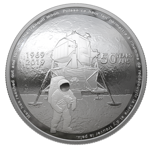 Designed by Canadian artist Tony Bianco, your coin features the iconic scene when humanity first set foot on the Moon, with the landing module towering in the background. It is marked with the memorable dates "1969" and "2019" and "50 years/ans" that have passed since the event. The messageof peace written by Pierre Elliott Trudeau on a tiny silicone disk that was left on the Moon also appears on the edge of the coin. The design features a rounded, convex shape reminiscent of the Moon.
