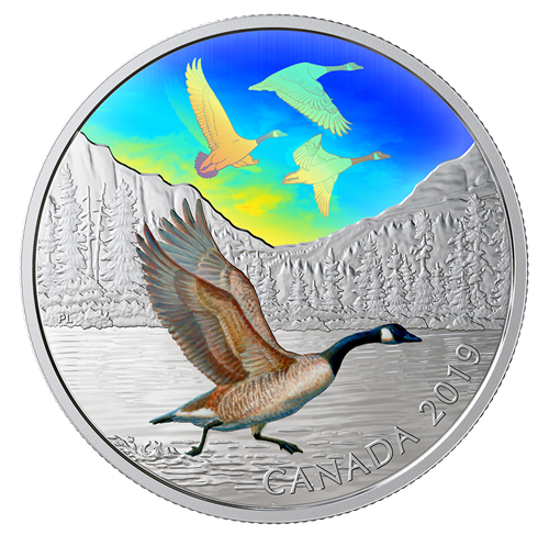 Designed by Pierre Leduc, the first coin in your subscription steps into the Canadian wilderness, where mountain peaks and evergreens add a soaring sense of majesty to the engraved lake setting. In the foreground, a selectively coloured Canada goose isdepicted just before lift off: its black head is thrust forward as it rushes headlong into the direction of its intended flight, with wings spread wide to gain momentum in order to join the others in the sky. The three flying geese are depicted in a multi-frame hologram, which re-creates the powerful wingbeatsand fluid flight movements that carry them across Canada’s skies. The reverse also includes the word “CANADA” and the year “2019”. The obverse features the effigy of Her Majesty Queen Elizabeth II by Susanna Blunt.