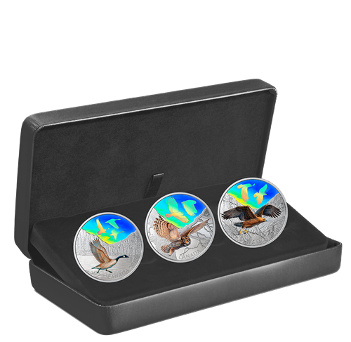Moving between the realms of land and sky, a bird’s airborne agility never fails to inspire awe. The Royal Canadian Mint’s Majestic Birds in Motion 3-coin series pays tribute to the marvel of avian flight through three great Canadian icons, whose graceful movements in ourskies are reproduced using multi-frame holograms.
