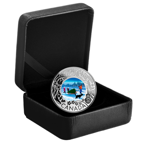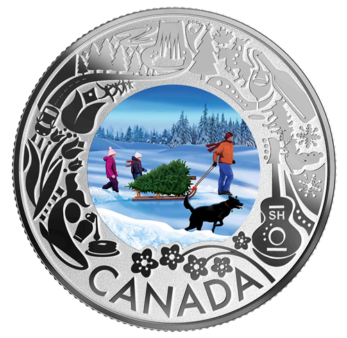 We're wrapping up our Fun and Festivities series with a little holiday magic! In Canada, December is a time for traditions oldand new, and one of them is selecting the perfect Christmas tree—as seen on this coin. Bundling up against the cold, the entire family heads out into thecountryside that shimmers after the first snowfall.Songs are sung and stories are told while everyonelooks for the future centrepiece of their holiday celebrations. Whether opting for a pre-cut or "cut-your-own" tree, the experience serves up apine-scented dash of holiday spirit that will carryyou into the new year!