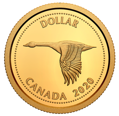 The reverse re-creates Canada's 1967 Centennial circulation dollar coin design by artist Alex Colville and featuresa profile view of a Canada goose in flight. The obverse features Canada's second effigy (1965-1989) of Her Majesty Queen Elizabeth II by Arnold Machin.