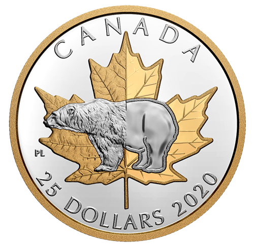 The reverse design by Canadian artist Pierre Leduc carriesgreat meaning by paying tribute to Canada’s evolving history through the two foremost national icons. Atransition marks the centre of the field, with classic depictions on the left to represent the nation’spast, and more contemporary versions on the right to represent both the present and beyond. Both icons are resplendent on this coin. Foremost is the polar bear, the majestic animal that symbolizes Canada’s Arctic wilderness. Its front half is texturally detailed, while the back portion transitions into a stylized silhouette that offers a more modern take on this Canadian icon. Behind it is the iconic maple leaf,whose serrated edges and deeply veined lobes are fixtures throughout the design. The left features a more natural and life-like appearance that evokes the reverse of the beloved Silver Maple Leaf (SML) coin,while the right portion places a strong emphasis onsymmetry and conveys a sense of strength. Also featured on the reverse are the engraved word “CANADA”, the face value “25 DOLLARS” and the year “2020.” Theobverse features the effigy of Her Majesty Queen Elizabeth II by Susanna Blunt.