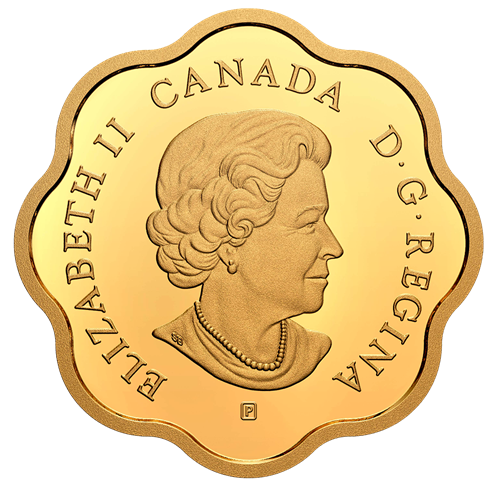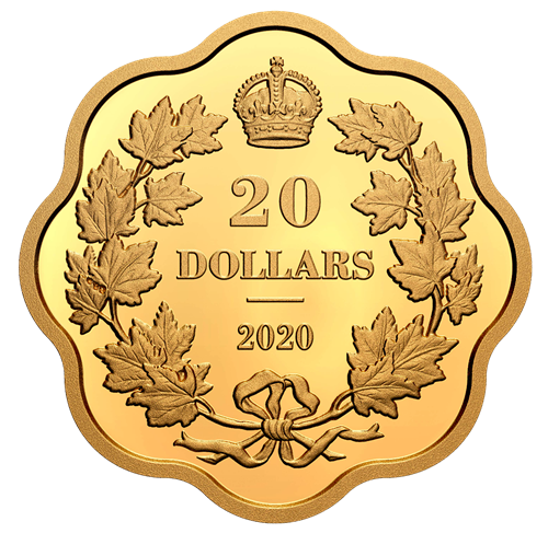 This fully gold-plated, scallop-shaped $20 coin is 99.99% pure silver, with a diameter of 38 mm and a nominal metal weight of 26.51 grams. The reverse features Leonard C. Wyon's crossed maple bough design, as seen on some of Canada's early coinage (1858-1936). The obverse features the effigy of Her MajestyQueen Elizabeth II by Susanna Blunt.