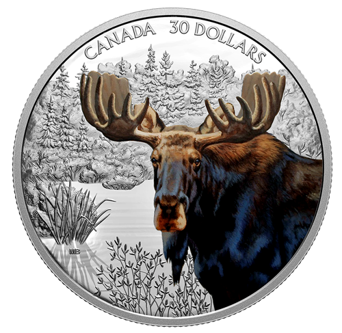 Designed by artist Maurade Baynton, the reverse features a selectively coloured, close-up view of the moose (Alces alces). The finely engraved backdrop showcases the moose’s natural habitat: the boreal forest that stretches across Canada. The obverse features the effigy of Her Majesty Queen Elizabeth II by Susanna Blunt.