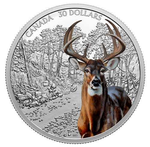Designed by artist Maurade Baynton, the reverse features a selectively coloured, close-up view of the white-tailed deer (Odocoileus virginianus). The finely engraved backdrop showcases the forest, one of the deer’s many habitats in Canada. The obverse features the effigy of Her Majesty Queen Elizabeth II by Susanna Blunt.