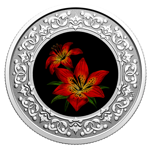 With its petals opened wide to soak up the sun, the boldly coloured western red lily easily stands out on our eighth Floral Emblems of Canada coin. Saskatchewan's official flower isthe image of summer beauty on the reverse, where anantique jewellery-inspired design provides an elegant frame for our floral-themed portrait.