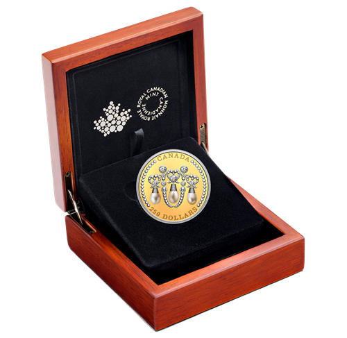 Your coin's reverse features an interpretation of the Lover's Knot Tiara. Seven diamonds add sparkle to the engraved knot and arch motif, while three natural freshwater pearls resemble the tiara's suspended gems.The intricate arrangement is enhanced with selective platinum plating. The commemorative obverse features scroll flourishes and the four effigies of Her Majesty Queen Elizabeth II that have appeared on Canadian coins since 1953.