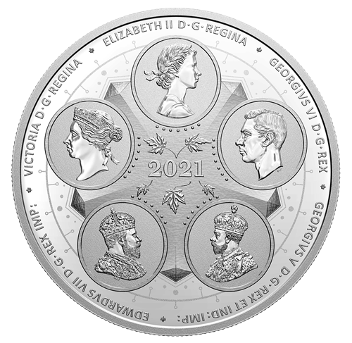 The multi-effigy obverse features the effigies of five monarchs who served as Canada's constitutional head of state between 1867 and 1967, and whose combined reigns span a century of change. Each effigy is accompanied by a Latin inscription stating the monarch's name and royal title, as seen on some of our most historic coins: