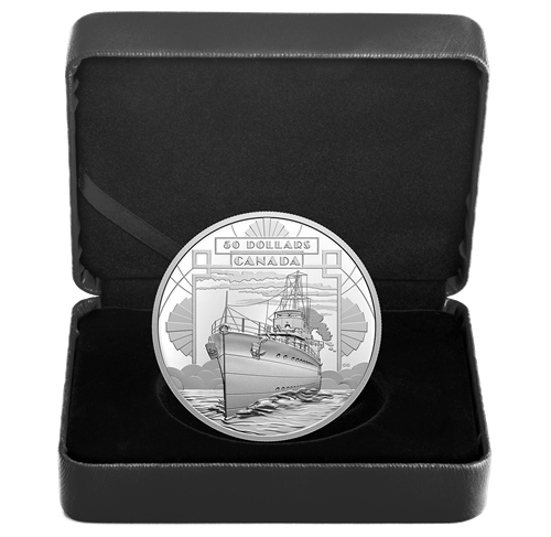 Designed by Canadian artist Glen Green, your coin's reverse features a symbol of a Canada's new-found standing on the world stage after the First World War (1914-1918). Art deco elements surround the depiction of HMCS Saguenay; built in 1931, the vessel was one of the first warships built for the Royal Canadian Navy before the naval service's rapid expansion during the Second World War (1939-1945). The obverse combines five of the effigies that have appeared on Canadian coins since 1867 (clockwise, from top): the first effigy of Her Majesty Queen Elizabeth II by Mary Gillick, with the Latin inscription "ELIZABETH II D·G·REGINA"; the effigy of King George VI by T. H. Paget, with the inscription "GEORGIVS VI D·G·REX"; the effigy of King George V by Sir E. B. Mackennal, with the inscription "GEORGIVS V D·G·REX ET IND: IMP:"; the effigy of King Edward VII by G. W. De Saulles, with the inscription "EDWARDVS VII D·G·REX IMP:"; and the effigy of Queen Victoria by L. C. Wyon, with the inscription "VICTORIA D·G·REGINA".