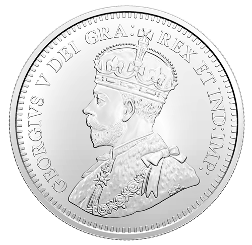 Designed by Canadian marine artist Yves Bérubé, your BU dollar's reverse travels back in time to see naval architect William James Roué (1879-1970)completing his design for the legendary Bluenose schooner. The first-person perspective is flat frosted to distinguish between Roué's vision and the inspiring sight of a traditional, brilliant uncirculated Bluenose under full sail. As an added tribute, W.J. Roué’s signature is included, as it appeared on the original Bluenose sail plan. The obverse features the effigy of King George V by Sir E. B. MacKennal.