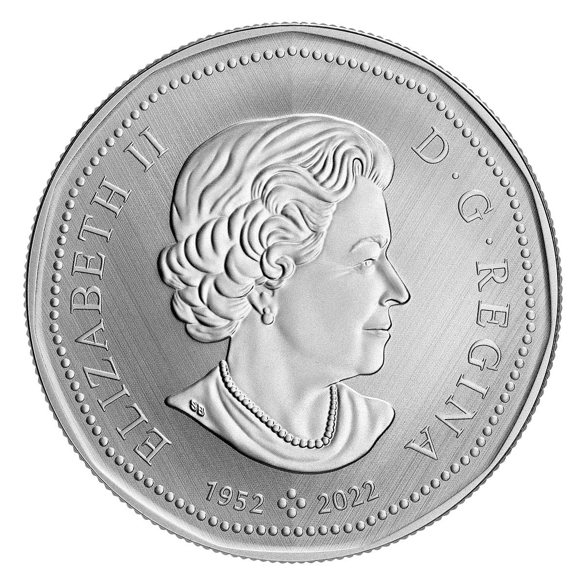 A numismatic tribute to Canada’s $1 circulation piece, this all-silver coin features Robert-Ralph Carmichael’s now-iconic “loon” design on its reverse, along with the “W” (Winnipeg) mint mark. The obverse features the effigy of Queen Elizabeth II by Susanna Blunt. The obverse also bears a special marking that includes four pearls symbolizing the four effigies that have graced Canadian coins and the double date of her reign.