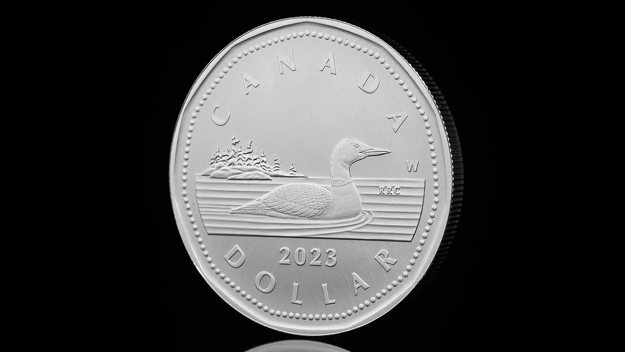 The loonie’s iconic loon-in-water design features a satin sheen, while the field’s textured appearance is th–e result of angled lines inspired by the Winnipeg Mint’s pyramid-shaped building.